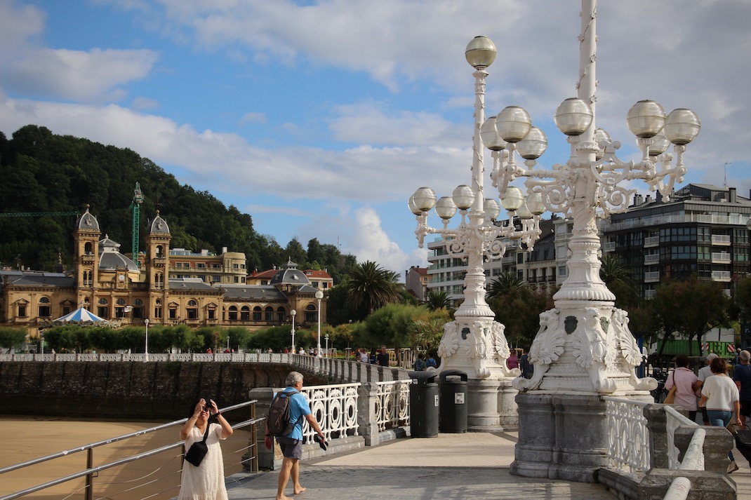 Mit den Worten „Ongi etorria!“ heißt uns dieser Teil der Welt willkommen. Mit zahlreichen Plakaten, Stickern und Graffiti lässt man uns wissen, dass wir nicht in Spanien sind, und dass die künftige Unabhängigkeit des Baskenlandes nicht zur Diskussion steht. Ebenso kämpferisch zeigen sich die Einwohner:innen, wenn es um die Durchsetzung einer ethisch vertretbaren Form des Tourismus geht. Auf Schritt und Tritt werden wir darauf hingewiesen, dass die hübsche Stadt mit ihrer muschelförmigen Bucht nicht zum Verkauf steht. Uns als vorüberziehenden Schienenpilger:innen erscheinen diese Bemühungen ehrwürdig, eine von Massentourismus geprägte Stadt wie etwa Venedig oder Hallstatt sieht aber doch nicht ganz so beschaulich aus. Durch Donostia/San Sebastián führt zwar der Camino del Norte, aber die meisten Pilger:innen wählen mit dem Camino Francés eine andere Strecke abseits der Küste.