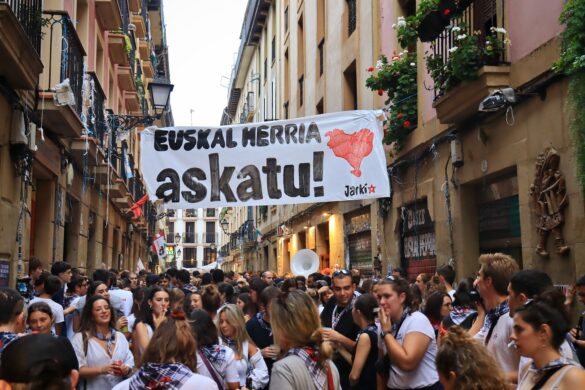 Abends stellen wir uns über eine halbe Stunde an, um in eines der hochgelobten baskischen Lokale zu kommen, wo es dann (wenig erstaunlich angesichts des Atlantiks vor der Haustüre) nur sehr wenige vegetarische Gerichte gibt. Mehr Vielfalt bieten die Pintxos, die baskischen Tapas, die ähnlichen Kultstatus genießen wie die Baskenmützen oder der Nationalsport Pelota. Garniert wird unser Abendessen mit dem fröhlichen Lärm eines Festes zu Ehren der heiligen Carmen, das mit lauten Rufen nach der Unabhängigkeit des Baskenlandes unterlegt wird.